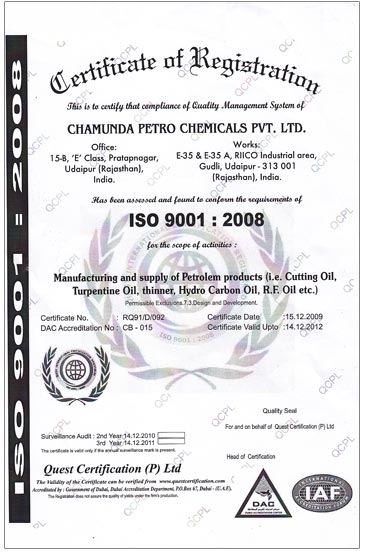 Chamunda Petro-Chemicals Pvt. Ltd. is a quality conscious company. In respect to quality improvement and along with the global standards, we have succeeded to achieve quality management certificate (ISO 9001:2008) from International Accreditation Forum throug DAC manufacturing and supplying of petrochemical products, Cutting Oil, Turpentine Oil, Thinner, Hydro Carbon Oil, RF Oil. Ours is one of the fastest growing commercial companies in India. |